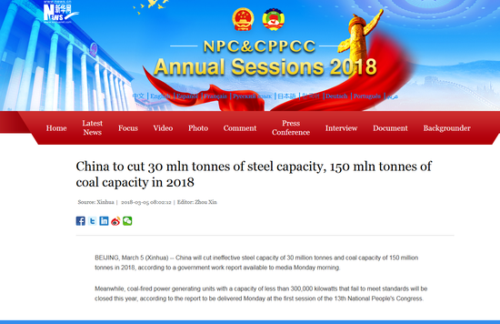 BEIJING, March 5 (Xinhua) -- China will cut ineffective steel capacity of 30 million tonnes and coal capacity of 150 million tonnes in 2018, according to a government work report available to media Monday morning.