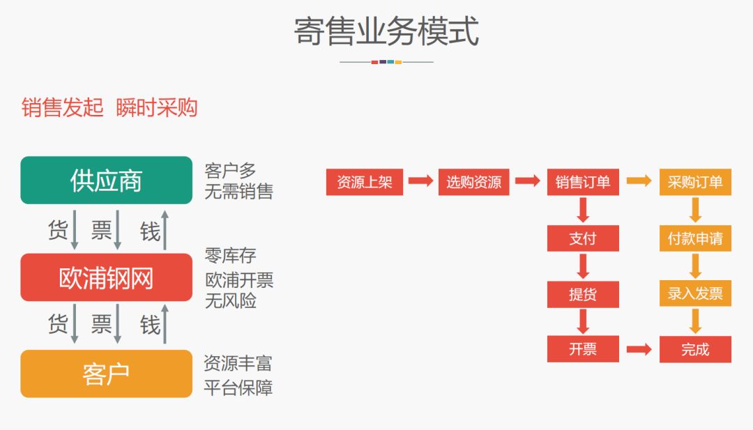 寄售业务的资源货权属于供应商,每天的可售资源、定价都由供应商制定,欧浦钢网仅负责销售。