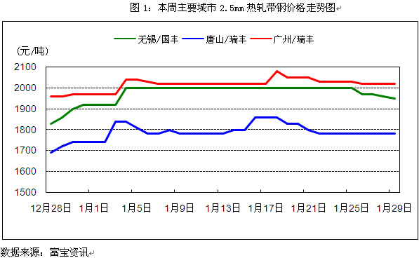 1、市场行情回顾 本周带钢稳中偏弱运行,其中华北主导钢厂霸州前进降了20元左右,而华东、华南地区则主流持稳,个别偏弱10-20元,目前市场基本上已经笼罩着假日的气氛,多数贸易商调价意愿不高,随行就市为主,个别贸易商趁着下游企业还有一些补库现象还在支撑着,下游企业缓慢在撤离市场,整体需求越发疲软,成交也始终不畅,而年前多由于雨雪天气影响,运输不方便,北方发货速度也较缓慢,所以供需双弱的格局下,市场行情变动不大。本周走势如下图所示: