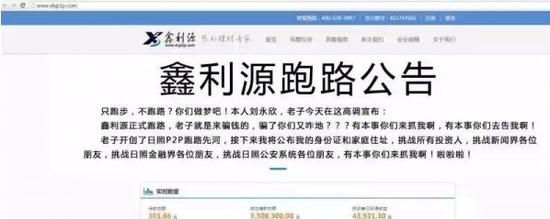 2月18日消息,曾在去年11月发布“跑路公告”P2P平台鑫利源,近日又在其网站首页发布奇葩跑路公告称:本人刘永欣,高调宣布鑫利源正式跑路,老子就是来骗钱的,骗了你们又咋地?目前,该网站已无法访问。