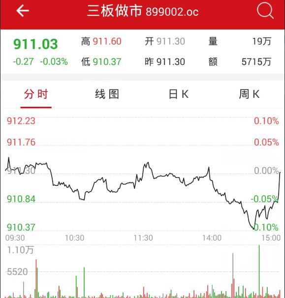 市场回顾 上周三新三板做市指数开盘后于盘中持续震荡,14:00之后下行,临近尾盘迅速拉升但未翻红,遭遇日线三连阴。 截至收盘,新三板做市指数报911.03点,跌0.27点,跌幅0.03%,成交5715万元。 ![]() |