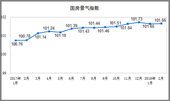 2月份,房地产开发景气指数(简称“国房景气指数”)为101.66,比去年12月份回落0.07点。