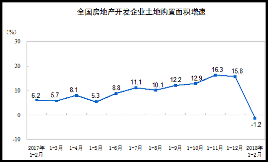 1-2月份,房地产开发企业土地购置面积2345万平方米,同比下降1.2%,去年全年为增长15.8%;土地成交价款794亿元,同比持平,去年全年为增长49.4%。