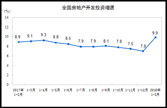 2018年1-2月份,全国房地产开发投资10831亿元,同比名义增长9.9%,增速比去年全年提高2.9个百分点。其中,住宅投资7379亿元,增长12.3%,增速提高2.9个百分点。住宅投资占房地产开发投资的比重为68.1%。