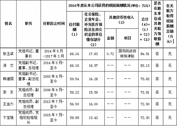 其中,神华集团董事长张玉卓2016年税前报酬为84.51万元,总经理凌文为83.13万元。中煤集团董事长李延江2016年领取的税前报酬为69.44万元,总经理彭毅为69.44万元。