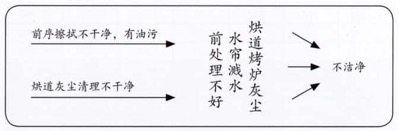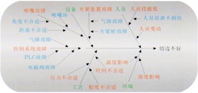 ![]() 从第一次数据分析的结果来看,切边不好、甩芯、不洁净、流挂、底气泡出现的几率最大,而且“调试不到位”正处在判断界限(一般80%)附近,也算一个高频率出现的不符合表象。在这6个不符合表象里,前三个占有比重加大,应采取优先减少。 下面,活动小组将分别对切边不好、甩芯、不洁净三种不符合表象进行分析。如下图所示: ![]() 切边不好鱼刺图分析 ![]() 桶底甩芯因果图 ![]() 不洁净桶身因果图 接下来的主要任务,是从分析的结果中筛选主要因和次要因。讨论要因的组成。在综合考虑可能出现的原因诱因之后,共识别出21个影响因素,其主要因2个,次要因3个。其结论如下表所示: