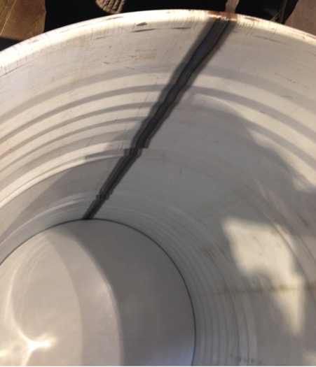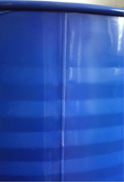 双色彩涂板钢桶 随后,我们又去车间看了彩涂板钢桶的生产情况,在生产车间发现,用目前的钢桶生产设备及工艺工装生产彩涂板钢桶,还存在下列问题,希望钢桶设备及工装企业配合钢桶厂及彩板厂共同努力,尽快解决此问题。 1、内涂层钢桶涂层质量问题 (1)从生产现场发现,对于彩涂板钢桶来说,双面涂层更经济实惠,但目前的内涂层采用的涂料不能满足钢桶包装盛装内容物的要求。这个问题彩涂板生产厂家已经与涂料供应商PPG在研制适合钢桶内涂层的彩涂涂料,以最高标准PVF为限,这样桶内可盛装各种化工及其他内容物。 (2)内涂层的厚度、遮盖力、光亮度、附着力及拉伸强度等均应符合目前钢桶内涂层质量要求,即成型后桶身内表面要求光滑、无漏点、无划痕和起泡等缺陷。 (3)内涂层钢桶桶身壁的磨损及焊缝补涂,目前试制的彩涂内涂钢桶,如下图所示。存在的问题有以下几个方面。