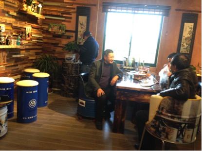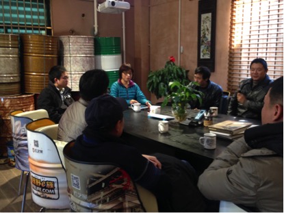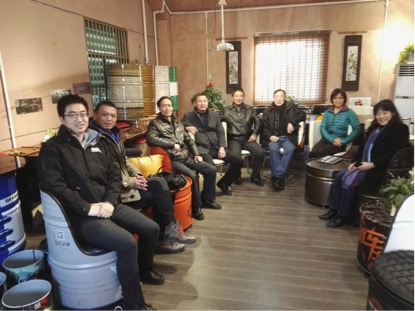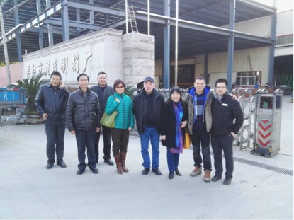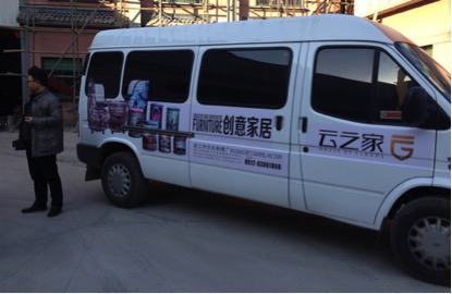 来访的朋友们在贝氏制桶厂门口合影 刚进工厂大门,就看见车上的云之家宣传,急着用手机拍下。