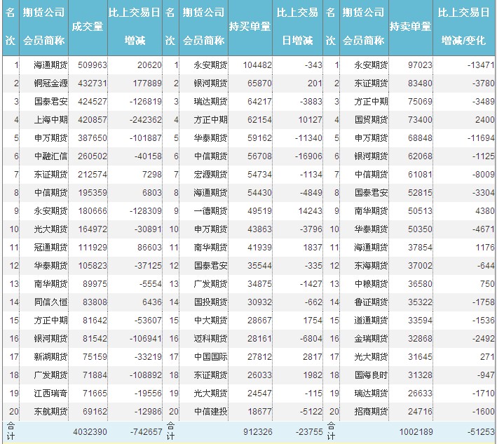 今日期螺主力1605合约成交量减少1250794手至5938474手,减幅17.40%;持仓量减少169030手至3157788手,减幅5.08%。从前20名会员交易情况来看: