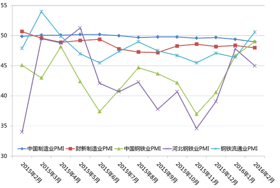 一、后市需求预期乐观 中间采购需求增加 1.商家备货不足 补库采购集中 由于今年钢贸商备货较少,社会钢材流通不多,中间补库采购较为集中。据兰格钢铁云商平台发布,2016年2月份钢铁流通业PMI总指数为50.6%,自去年4月以来首次进入扩张区间,2月份销售量指数为44.2%,较上月回升1.3个百分点,表明钢铁流通市场活跃度上升。2月份采购意愿指数为53.6%,环比上升9.1个百分点,重返荣枯线上,显示钢贸企业采购需求较强。 2.订单连续好转 钢厂积极复产 据中物联钢铁物流专业委员会统计数据显示,2月份钢铁行业PMI指数为49.0%,较上月回升2.3个百分点,连续三月回升至2014年5月份以来的最高点。尤其是反映需求端变化的新订单指数明显向好,2月份钢铁行业新订单指数两连升至50.9%,较上月上升1.0个百分点,时隔19个月以后再度回到50%的荣枯线以上,显示钢厂接单量明显增长,市场采购需求持续回升。但值得注意的是,2月份生产指数升至近18个月以来的最高,新出口订单指数重新回落至50%以下的收缩区间,产成品库存指数大幅上升,显示钢厂复产意愿强烈,出口受阻,后期供应压力或将加大。同时粗钢产量第一大省也呈现出同样的趋势,据河北省冶金协会统计数据显示,2016年2月份河北省钢铁行业PMI为45%,环比下降2.8个百分点,连续9个月处于荣枯线下方。2月份新订单指数为52.4%,环比持平,连续两个月保持在荣枯线上方。2月份新出口订单指数为43.8%,环比下降9.8个百分点,创7个月来最低水平。随着钢厂经营状况继续好转,越来越多的钢厂准备复产,市场供应充足,与此同时,3月份建筑工地普遍开工,下游需求将逐步放量。