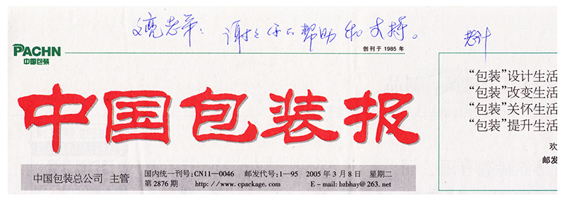 陈云在《中国包装报》创刊时为报头题字 近期,对于整个包装行业而言,最令人扼腕叹息的莫过于是《中国包装报》宣布5月21日停刊。从1985年4月1日正式创刊,《中国包装报》伴随着我们包装行业走过了风风雨雨三十年。而这三十年,正是中国改革开发繁荣发展的时期,整个包装行业也随之突飞猛进。 《中国包装报》的辉煌历史 《中国包装报》是由中国包装总公司、中国包装联合会主管的行业媒体,创刊于1985年4月1日,一直是中国包装行业唯一的国内外公开发行的行业报纸。 《中国包装报》作为包装原材料、包装制品、包装印刷、包装机械等生产企业和包装科研、教育等单位传播实用信息的重要媒介,其主要宣传国家有关包装行业的政策法规,报道国内外包装行业的成就和发展方向,介绍国内外包装企业在加强管理、技术进步、开拓市场等方面的成功经验;推广包装新产品、新材料、新设备、新工艺,刊发包装原辅材料的价格和市场供求信息;为各行各业的各类产品提供改进包装的先进方法和经验。