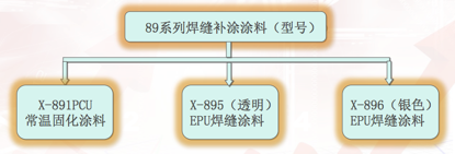 下面我就介绍一下我们的89系列焊缝补涂涂料,该系列涂料主要有:X-891PCU常温固化涂料、X-895(透明)EPU焊缝涂料、X-896(银色)EPU焊缝涂料,X-898印铁制桶专用焊缝涂料。