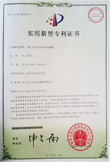 杨文亮 最近,江苏省吴氏制桶有限公司通过两年的研究和努力,成功完成了七层矩形卷边钢桶的新产品研制工作,获得国家专利,现进入了大批量生产阶段。 七层矩形卷钢桶,是近年来开始流行于欧美的高强度钢桶,一些国外用户的出口包装经常要求采用七层矩形卷边钢桶。这种新型的卷边型式,比传统的七层圆卷边,具有更好的密封性能,也同时具有更好的卷边处高强度。在用户需求的推动下,从2014年开始,吴氏制桶有限公司对七层矩形卷边钢桶进行了一边研制一边生产,当年就获得了国家实用新型技术专利,现技术已经成熟,进行批量生产。七层矩形卷边钢桶在中国的诞生,标志着中国钢桶自1985年七层圆卷边钢桶诞生后,又一次与国际技术实现了同步发展。 图1为吴氏制桶有限公司获得的国家实用新型专利证书。图2为批量生产的七层矩形卷边钢桶。图3为吴氏制桶生产的七层矩形卷边钢桶卷边部位的剖面图。图4为七层矩形卷边钢桶卷边部位外形实物图。